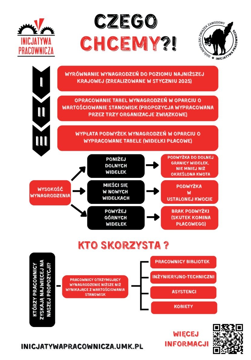 - Inicjatywa Pracownicza UMK nie zgodziła się podpisać propozycji porozumienia z dnia 28 maja 2025 ponieważ stoi na stanowisku, że w pierwszej kolejności powinny zostać naprawione siatki płac, które od lat nie są aktualizowane, albo aktualizowane tylko na zasadzie odzwierciedlenia stanu faktycznego, a nie merytorycznych przesłanek wynikających z eksperckiego wartościowania stanowisk pracy. Dotyczy to w szczególności sytuacji pracowników nienaukowych, ponieważ widełki minimalne pracowników naukowych są ustalane przez ministerstwo na podstawie minimalnej wysokości wynagrodzenia zasadniczego profesora uczelni publicznej.