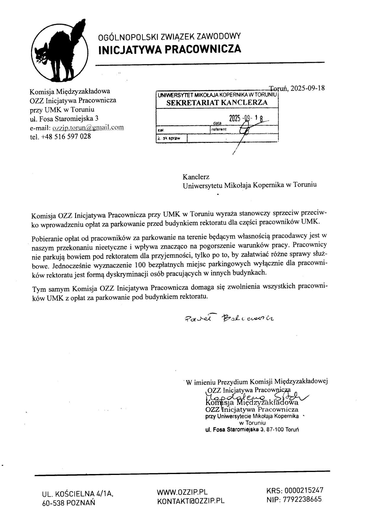 Nasza Komisja sprzeciwia się wprowadzeniu opłat za parkowanie na kampusie na Bielanach.