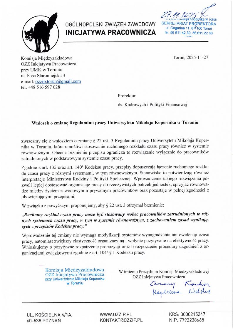 Nasza komisja złożyła wniosek w sprawie ruchomego i równoważnego czasu pracy