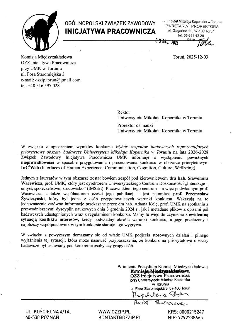 Wyniki zorganizowanego przez UMK konkursu na priorytetowe obszary badawcze budzą przypuszczenia, że nie był to uczciwy konkurs. Złożyliśmy pismo w tej sprawie.